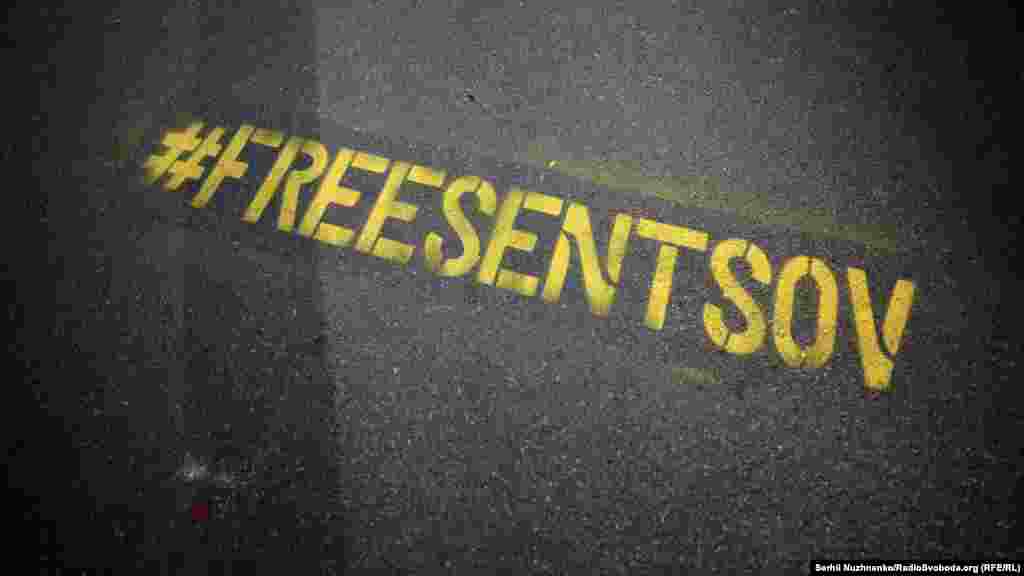Во время акции активисты краской нанесли на подходе к офису Медведчука надписи «FreeSentsov»