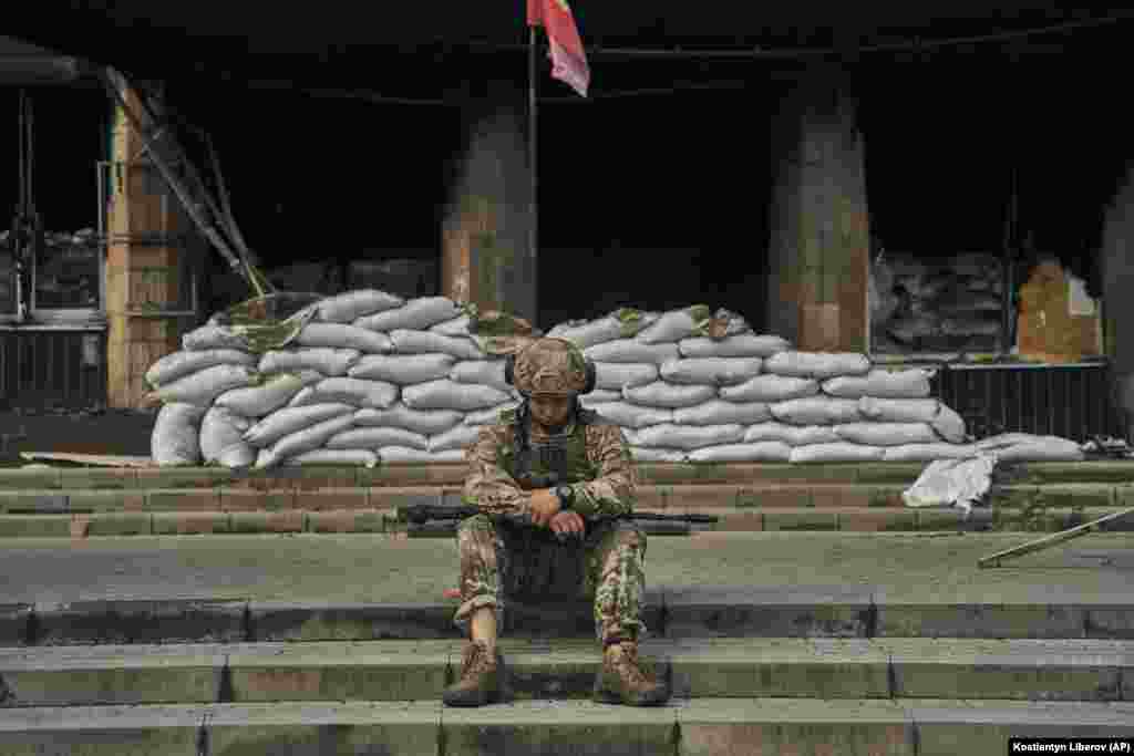 Украинский военный отдыхает на брошенном российскими военными во время бегства из Изюма трофейном бронетранспортере. 13 сентября